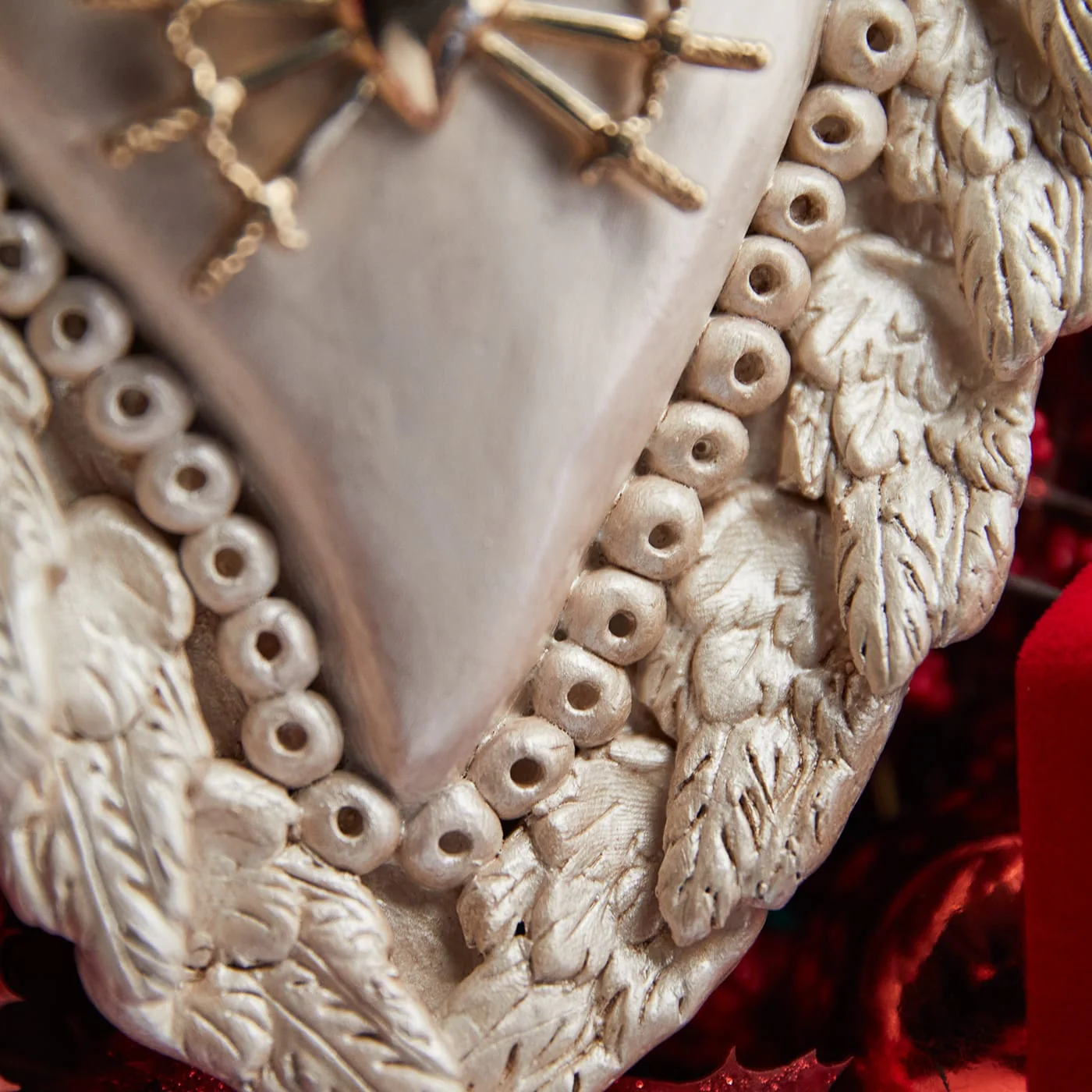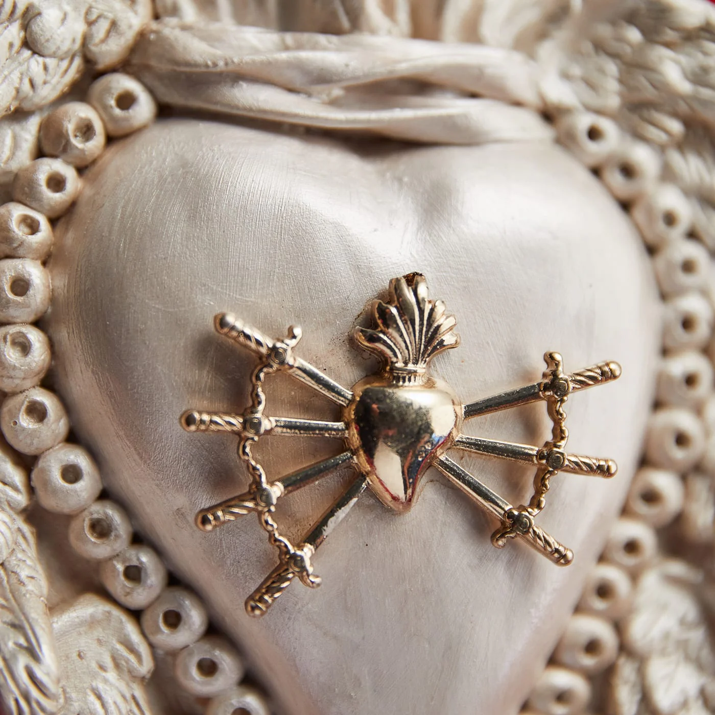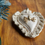 La meticolosa maestria artigianale contraddistingue questo grazioso cuore in ceramica bianca dal fascino barocco da ex voto. Con al centro un iconico cuore con sette spade, circondato da un bordo svolazzante di ali d’angelo piumate, la sua eterea eleganza infonderà un’atmosfera angelica in qualsiasi spazio interno.